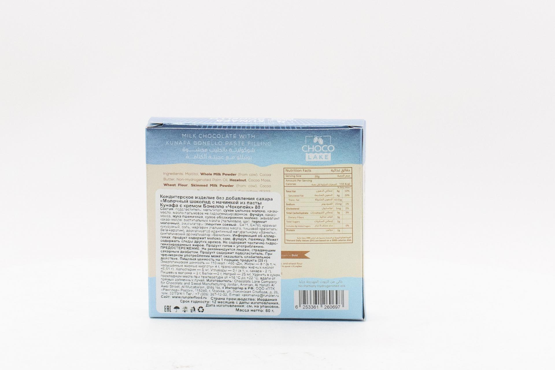 Молочный шоколад Choco Lake с начинкой из пасты Кунафа с кремом Бонелло (Иордания) 80г